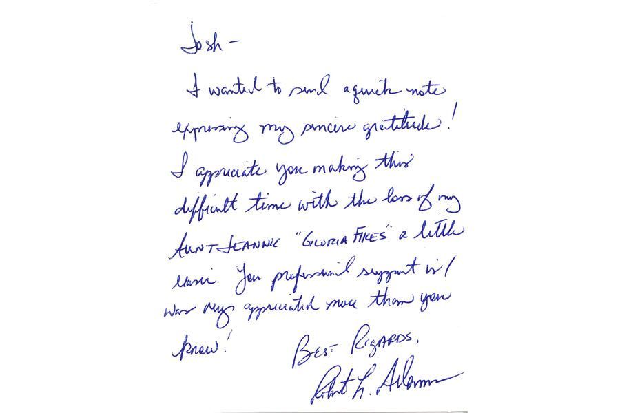 I wanted to send a quick note expressing my sincere gratitude! I appreciate you making this difficult time with the loss of my Aunt Jeanne “Gloria Fixes” a little easier. Your professional support is/was very appreciated more than you know!