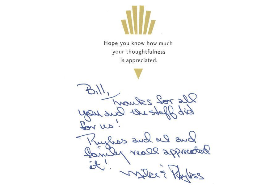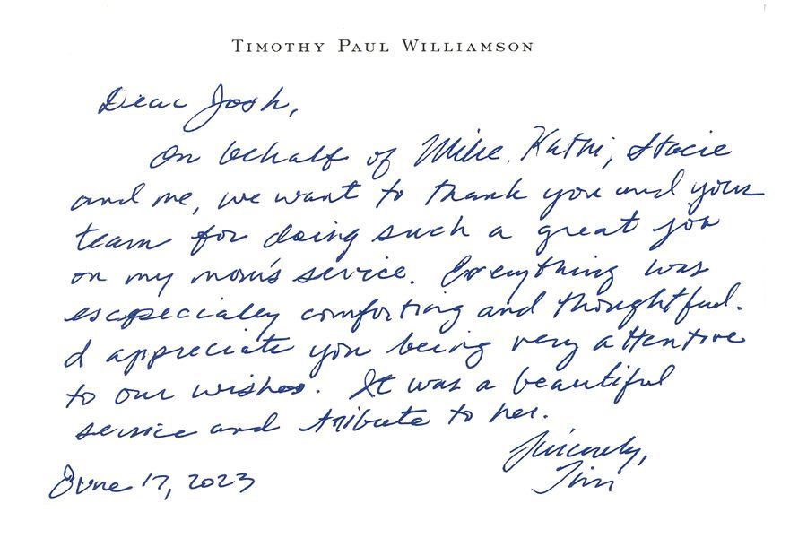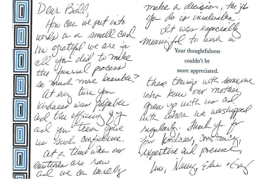 How can we put into words in a small card how grateful we are for all you did to make the funeral process so much more bearable? At any time your kindness was palpable and the efficiency of your team gave us such confidence. At a time when our emotions are raw and we can barely make a decision, the job you do is invaluable. It was especially meaningful to work through these things with someone who knew our mother, grew up with us and with whom we worshipped regularly. Thank you for your kindness, constancy, expertise, and presence.