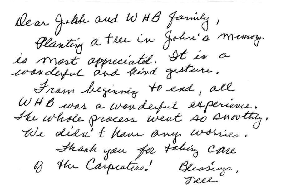 Planting a tree in John’s memory is most appreciated. It is a wonderful and kind gesture. From beginning to end, all WHB was a wonderful experience. The whole process went so smoothly. We didn’t have any worries. Thank you for taking care of the Carpenters!