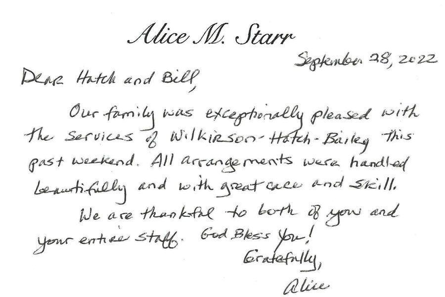Our family was exceptionally pleased with the services of Wilkirson-Hatch-Bailey this past weekend. All arrangements were handled beautifully and with great care and skill. We are thankful to both of you and your entire staff. God Bless You!