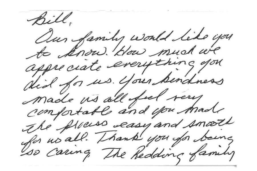 Our family would like you to know how much we appreciate everything you did for us. Your kindness made us all feel very comfortable and you made the process easy and smooth for us all. Thank you for being so caring.