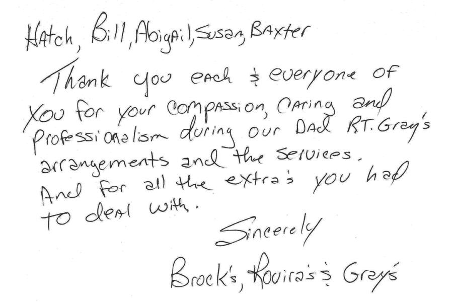 Thank you each & everyone of you for your compassion, caring and professionalism during our Dad R.T. Gray’s arrangements and the services. And for all the extras you had to deal with.