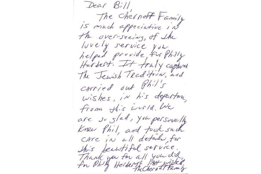 The Chernoff Family is much appreciative in the overseeing of the lovely service you helped provide for Philly Herbert. It truly captured the Jewish Tradition and carried out Phil’s wishes, in his departure from this world. We are so glad you personally knew Phil and took such care in all details for this beautiful service. Thank you for all you did for Philly Herbert.