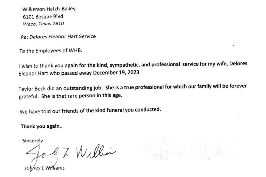 I wish to thank you again for the kind, sympathetic, and professional service for my wife, Delores Eleanor Hart who passed away December 19, 2023.