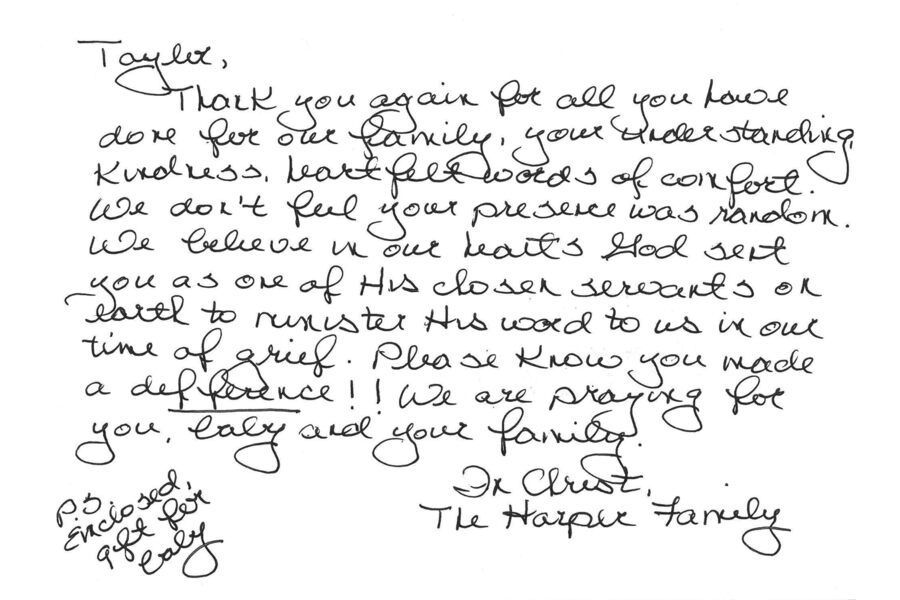 Taylor, thank you again for all you have done for our family, your understanding, kindness, heartfelt words of comfort. We don’t feel your presence was random. We believe in our hearts God sent you as one of His closest servants on Earth to minister His word to us in our time of grief. Please know you made a difference!! We are praying for you, Taylor and your family. In Christ, The Harper Family