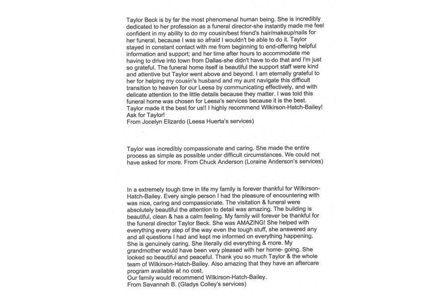 Taylor Beck is by far the most phenomenal human being. She is incredibly dedicated to her profession as a funeral director—she instantly made me feel confident in my ability to do my cousin/best friend’s hair/makeup/nails for her funeral, because I was so afraid I wouldn’t be able to do it. Taylor stayed in constant contact with me from beginning to end—offering helpful information and support; and her time after hours to accommodate me having to drive into town from Dallas—she didn’t have to do that and I’m just so grateful. The funeral home itself is beautiful the support staff were kind and attentive but Taylor went above and beyond. I am eternally grateful to her for helping my cousin’s husband and my aunt navigate this difficult transition to heaven for our Leesa by communicating effectively, and with delicate attention to the little details because they matter. I was told this funeral home was chosen for Leesa’s services because it is the best. Taylor made it the best for us!! I highly recommend Wilkirson-Hatch-Bailey! Ask for Taylor!