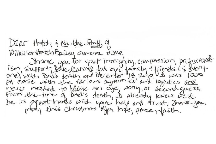 Dear Hatch, & all the staff of Wilkirson Hatch Bailey Funeral Home, thank you for your integrity, compassion, professionalism, support, love, (caring for our family & friends (& everyone) with Dad’s death on December 18, 2010. I was 100% at ease with the various dynamics and logistics and never needed to blink an eye, worry, or second guess. From the time of Dad’s death, I already knew he’d be in great hands with your help and trust. Thank you. May this Christmas offer hope, peace, faith.