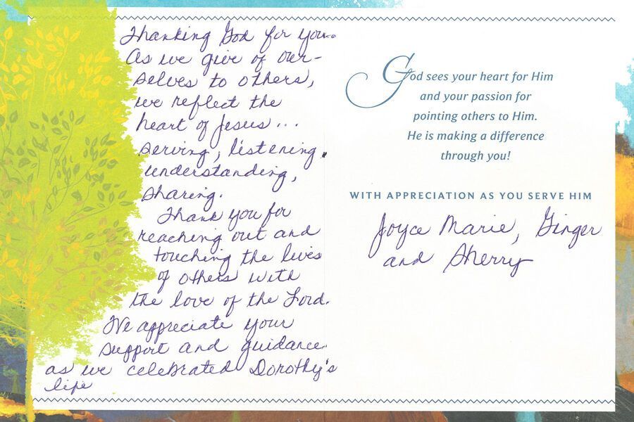 Thanking God for you. As we give of ourselves to others, we reflect the heart of Jesus... serving, listening, understanding, sharing. Thank you for reaching out and touching the lives of others with the love of the Lord. We appreciate your support and guidance as we celebrated Dorothy’s life.