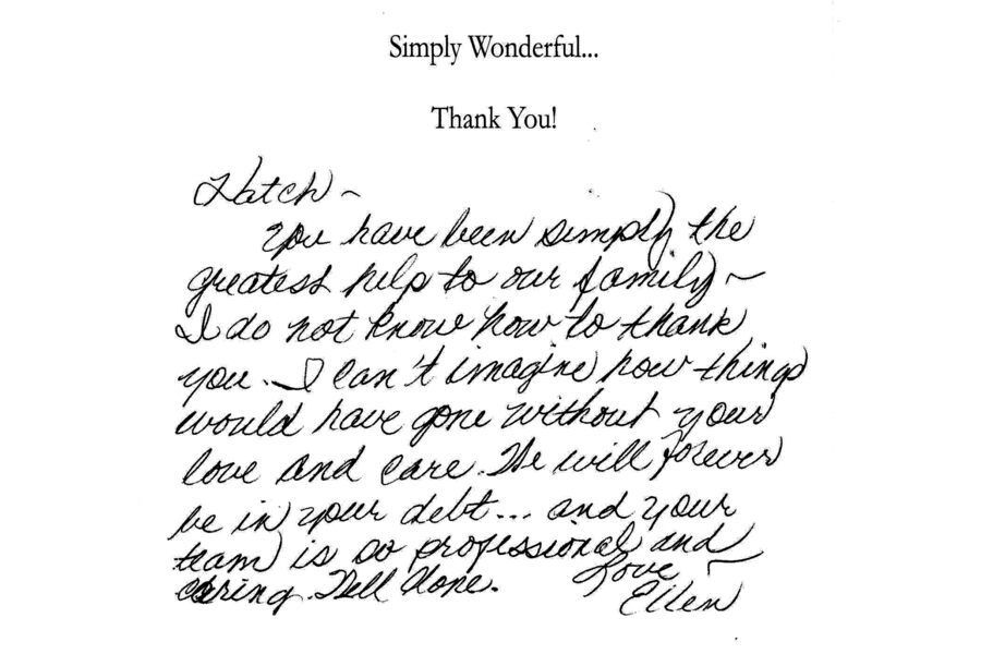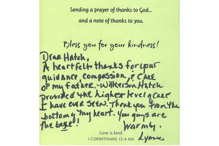 A heartfelt thanks for your guidance, compassion, & care of my father. Wilkerson Hatch provided the highest level of care I have ever seen. Thank you from the bottom of my heart. You guys are the best!
